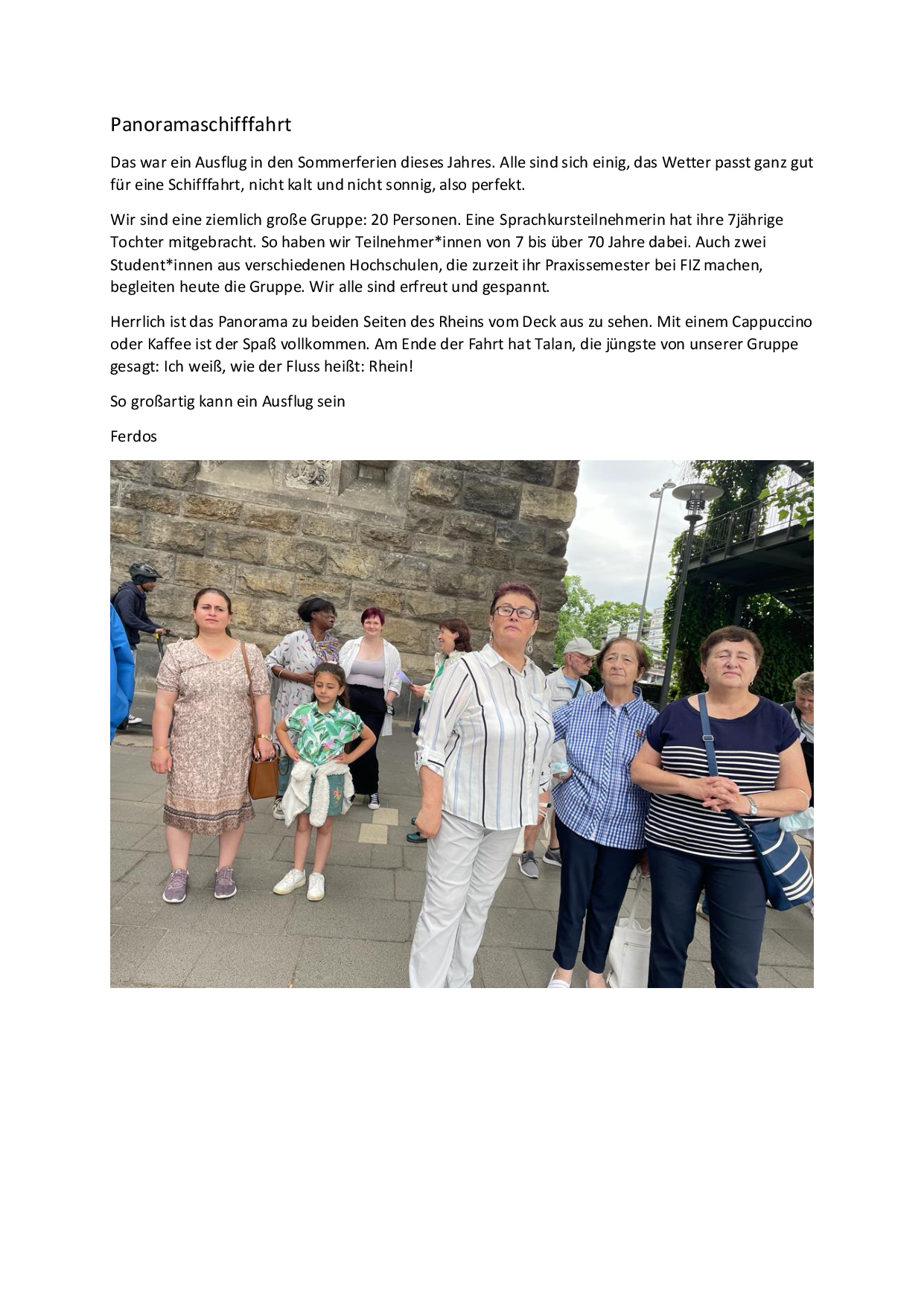 FIZ ist mein zweites Vaterhaus. Es rettet mich vor der Einsamkeit. Besonders, wenn wir regelmäßig Unterricht haben.Eine große Freude für mich sind unsere Ausflüge, unsere Spaziergänge, Museumsbesuche und die vielen neuen Eindrücke.Jetzt in unserer schweren Corona-Zeit haben alle Leute große Angst zusammen zu sein, außerdem sind einige Grenzen geschlossen.Deshalb macht mir dieser Kontakt und die Unterhaltung im kleinen Kreis mit den Kolleginnen viel Spaß und Freude.