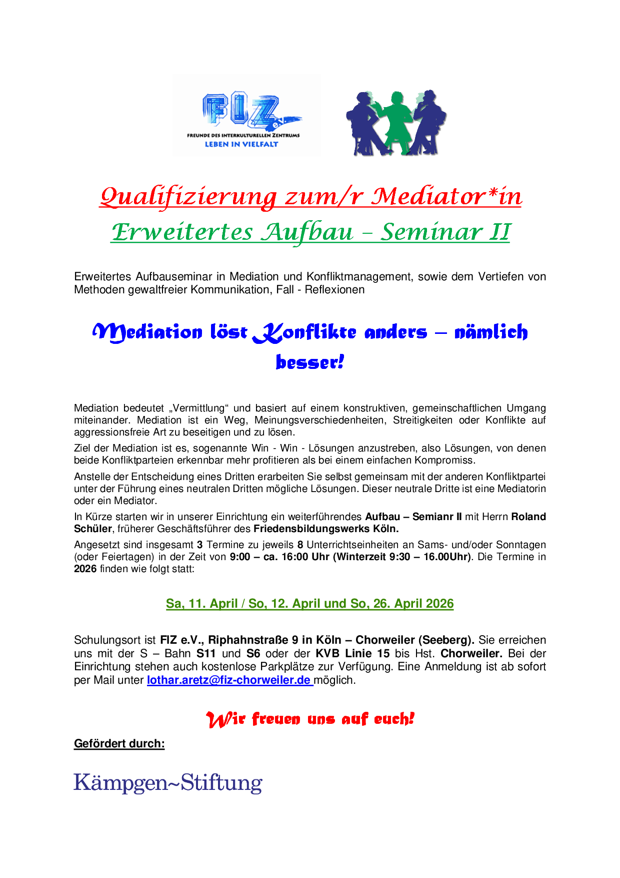 Seit 2016 findet bei FIZ e.V. jährlich ein Qualifizierungsseminar zur Mediatorin/ zum Mediator statt. Als Dozenten konnten wir von Beginn an Roland Schüler gewinnen, langjähriger Geschäftsführer des Friedensbildungswerks Köln e.V..